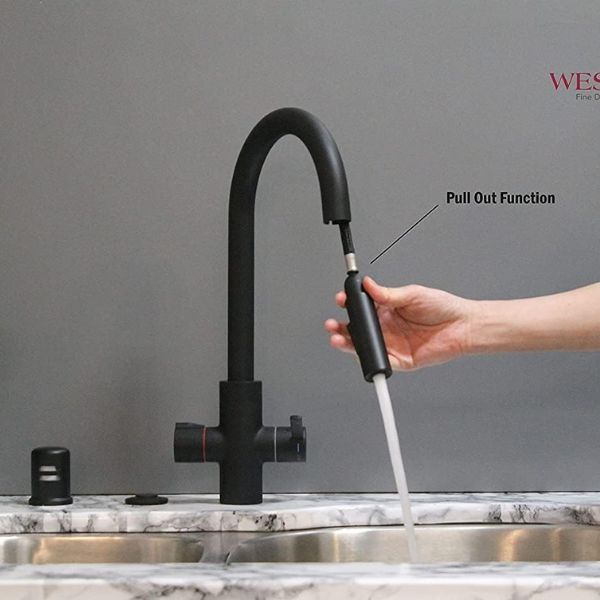 - DUAL SPRAY MODE FAUCET WITH PULL OUT SPAY HEAD: Faucet features a pull-out spray head with dual waterways, an aerated one for dishes, and the center spout for the instant hot water appliance.
