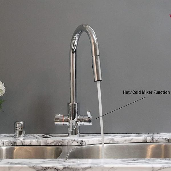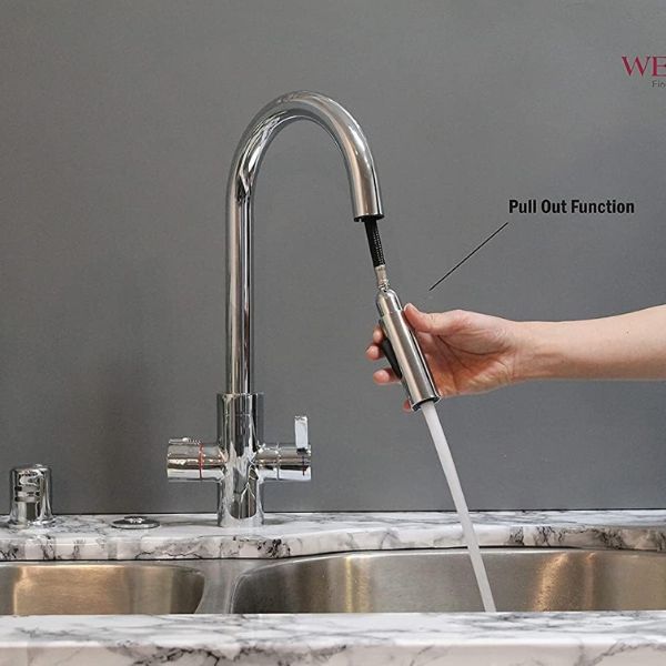 - DUAL SPRAY MODE FAUCET WITH PULL OUT SPAY HEAD: Faucet features a pull-out spray head with dual waterways, an aerated one for dishes, and the center spout for the instant hot water appliance.